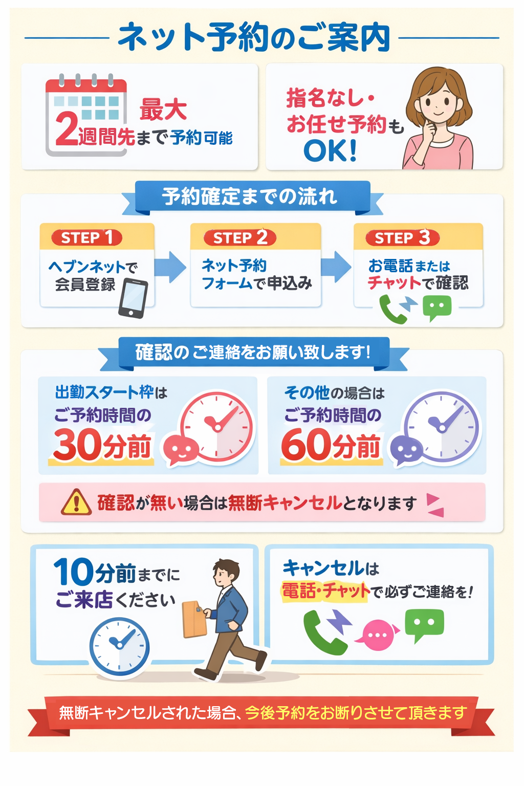 ただし、予約確認時間(出勤スタート枠は予約時間30分前、それ以外の場合は予約時間60分前)を過ぎてのキャンセルは無断キャンセルとなります。
